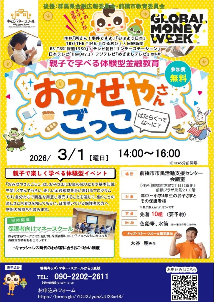 群馬キッズマネースクールからっ風校(Mサポ利用登録者)から、「おみせやさんごっこ~はたらくってな~に?」のお知らせです。