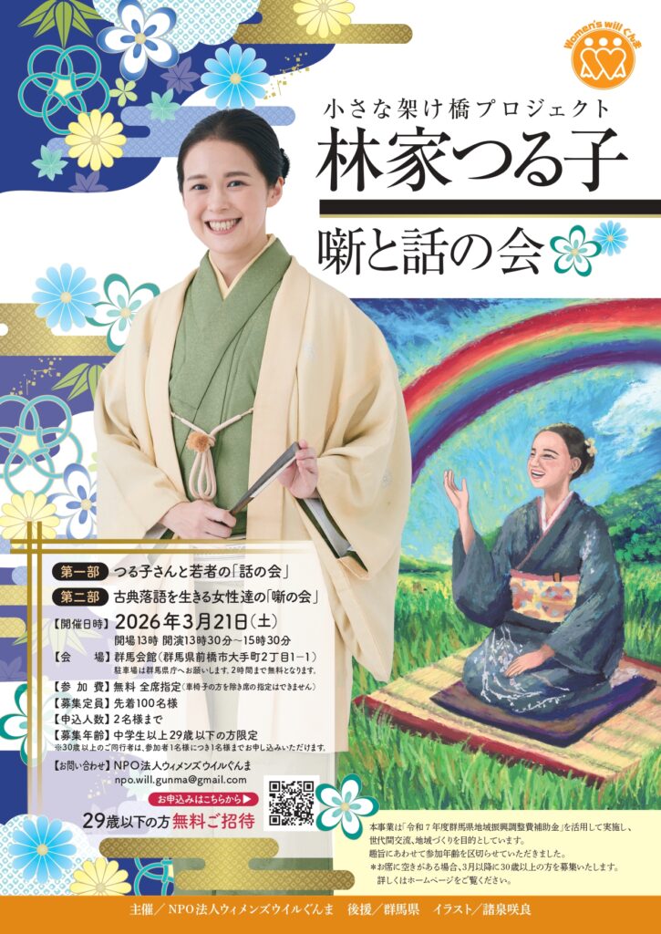 NPO法人ウィメンズウイルぐんま(Mサポ利用登録者)から、「林家つる子「噺と話の会」無料ご招待」のお知らせです。