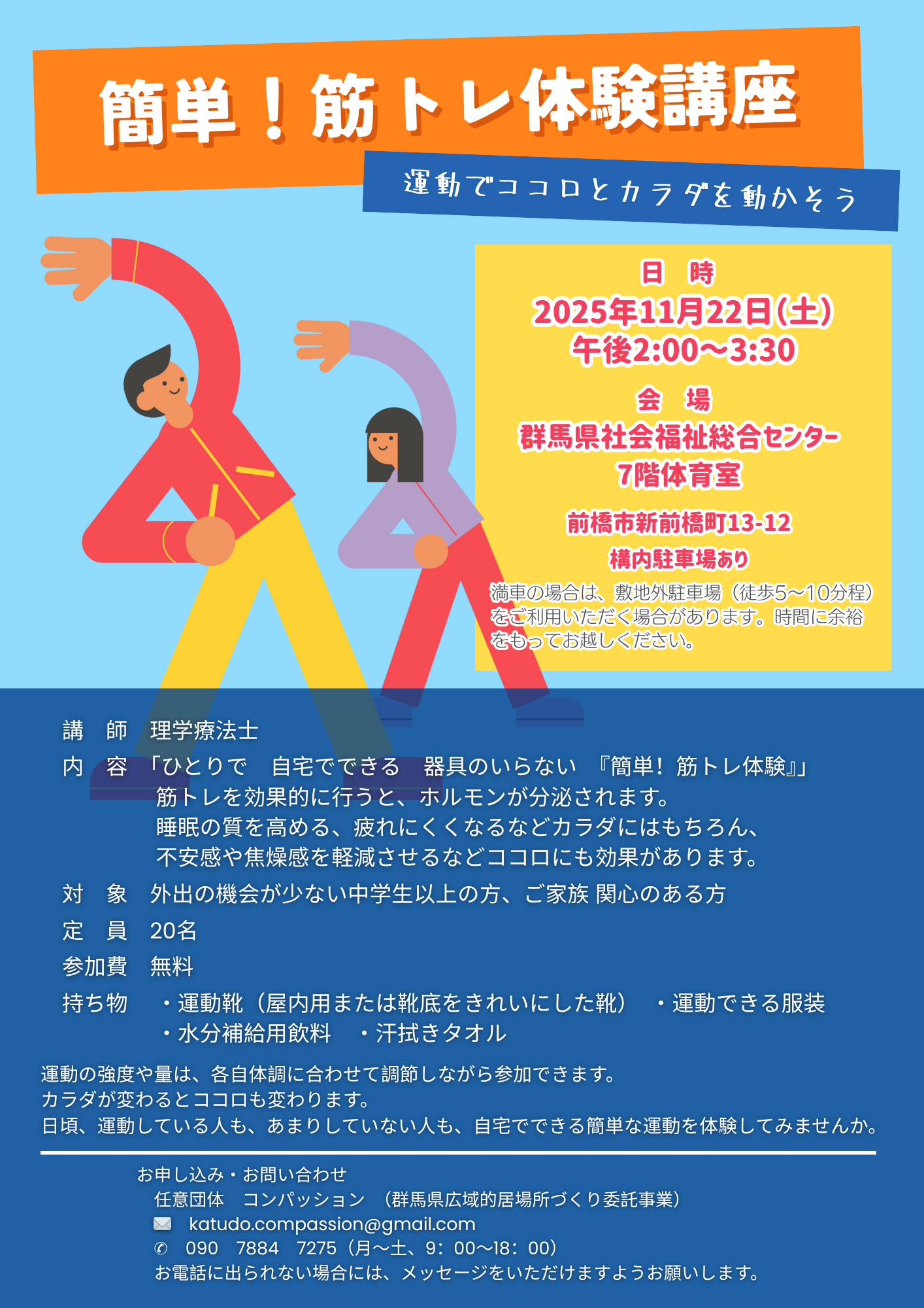コンパッション(Mサポ利用登録者)より、「簡単!筋トレ体験講座」~運動でココロとカラダを動かそう~のお知らせです。