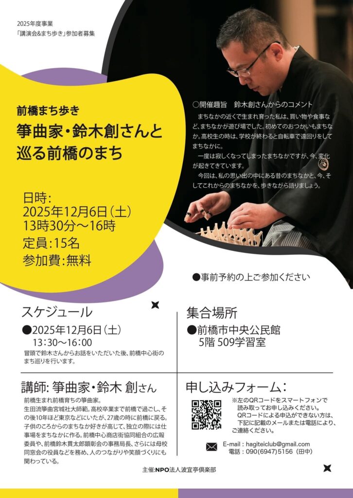 日時:2025年12月6日(土)13:30~16:00開催場所:前橋市内(集合場所:前橋市中央公民館5階 509学習室)参加費:無料申込み:申込みフォームより