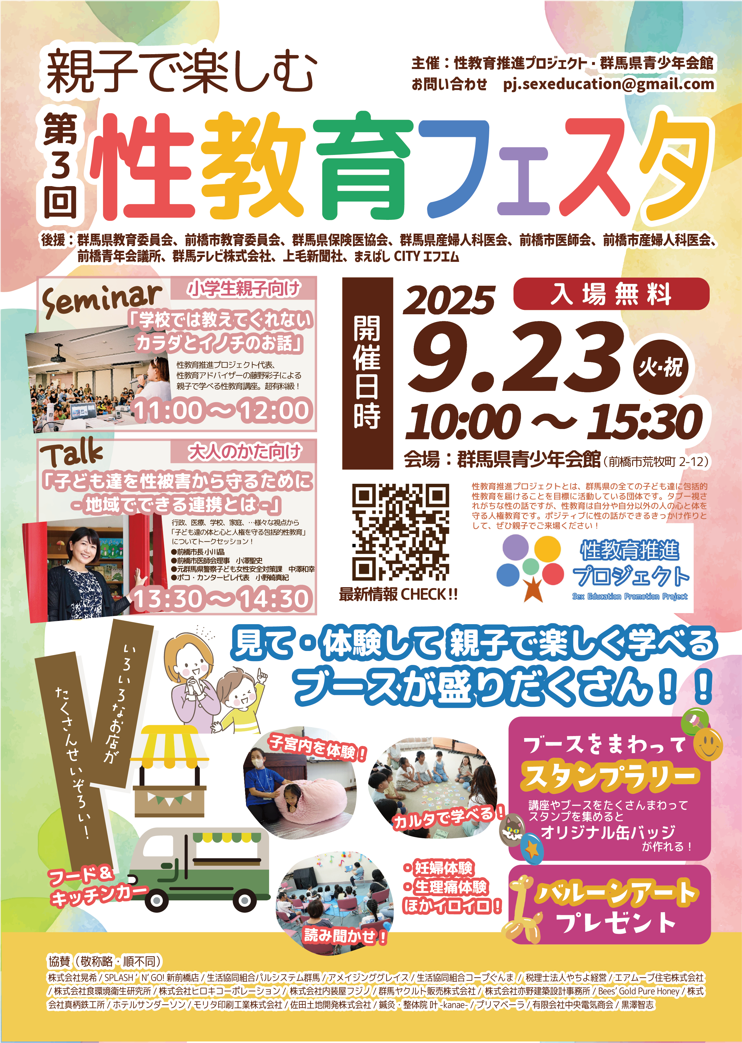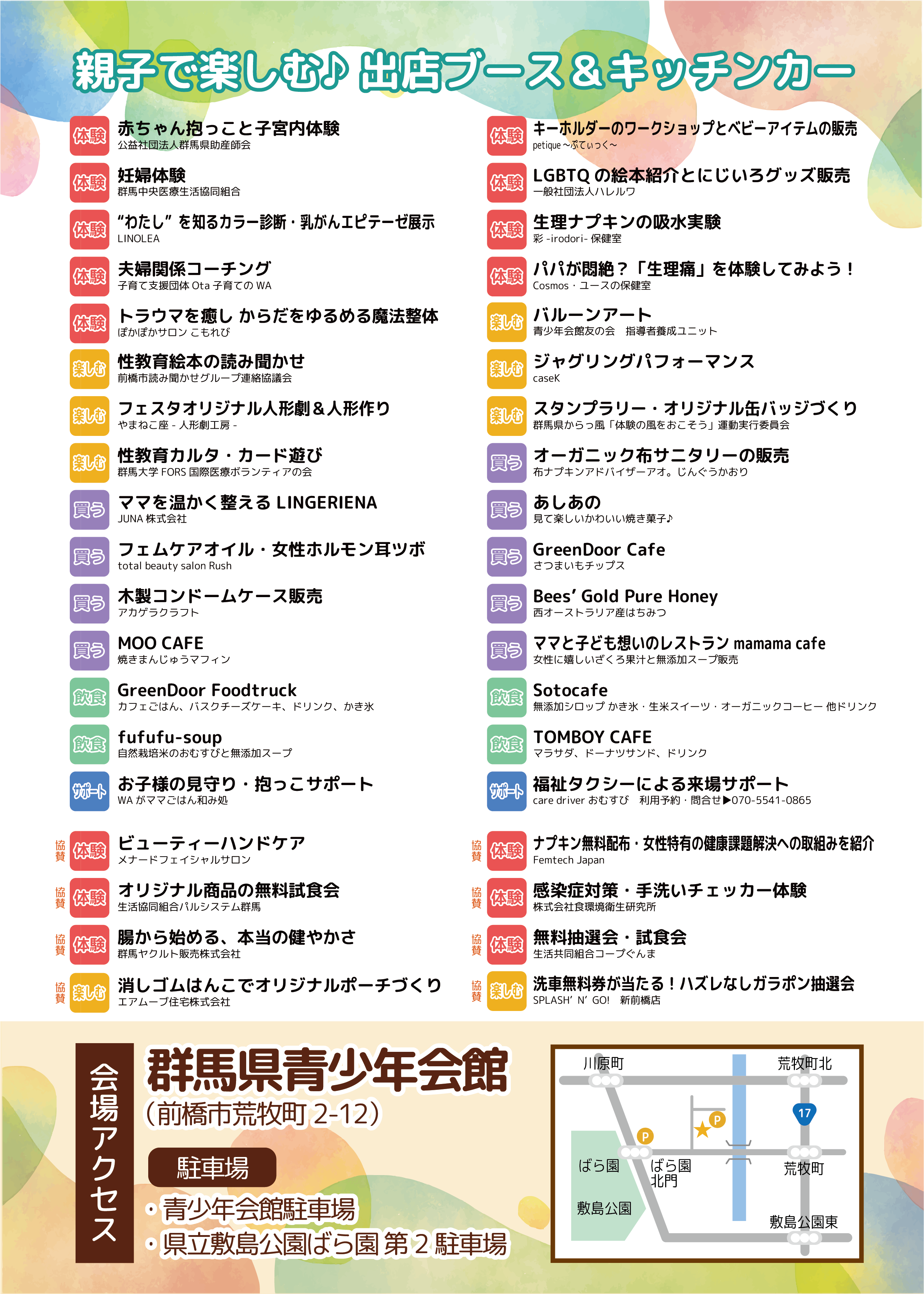 群⾺県教育委員会、前橋市教育委員会、群馬県保険医協会、群馬県産婦人科医会 、前橋市医師会、前橋市産婦人科医会、前橋⻘年会議所、 群⾺テレビ株式会社、上⽑新聞社、まえばしCITYエフエム