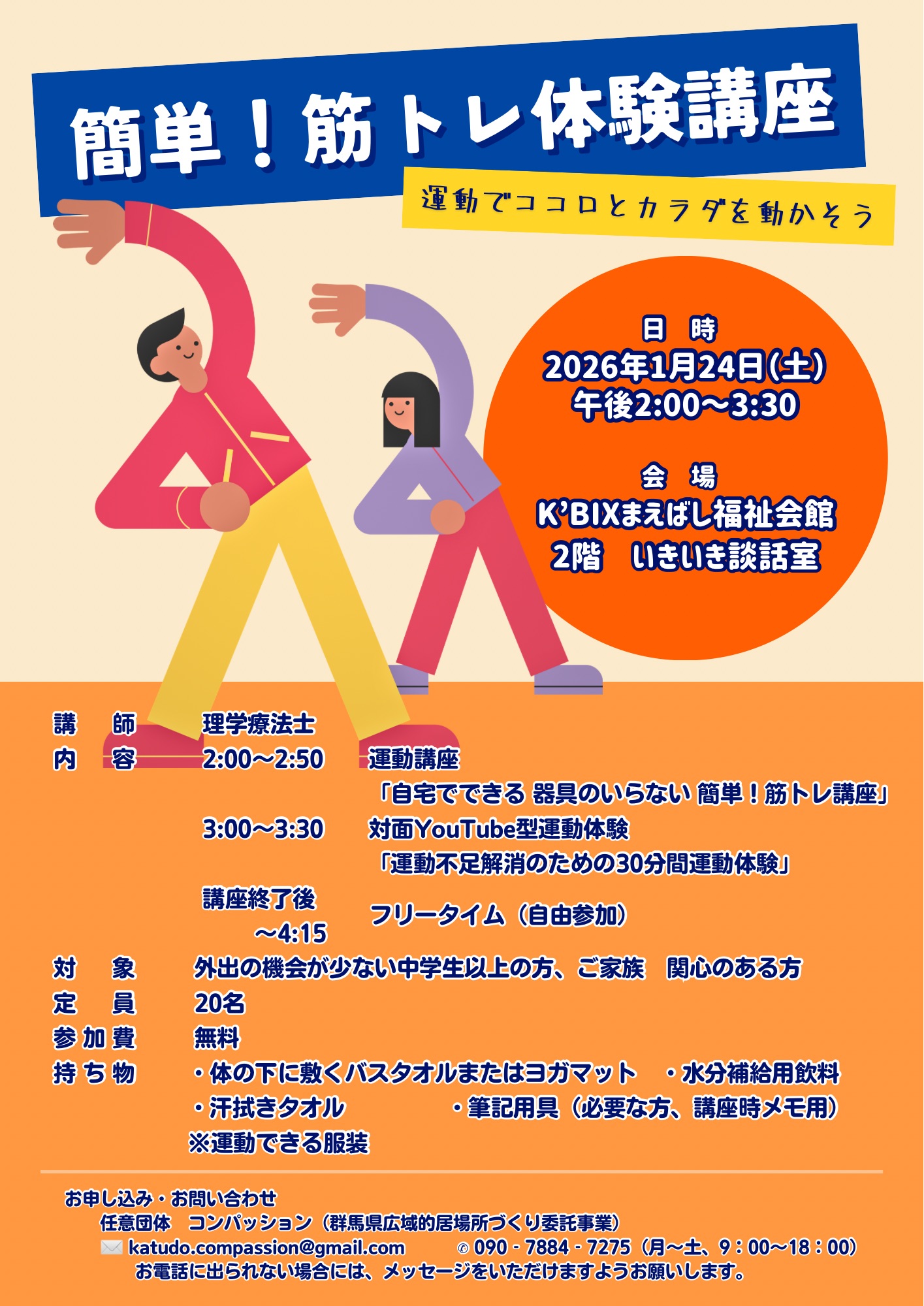 コンパッション(Mサポ利用登録者)より、「簡単!筋トレ体験講座~運動でココロとカラダを動かそう~」のお知らせです。