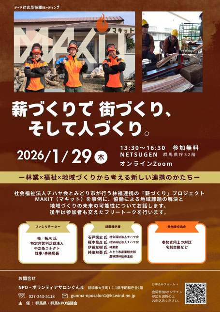 NPO・ボランティアサロンぐんまから、協働ミーティング「薪づくりで 街づくり、そして人づくり。」のお知らせです。