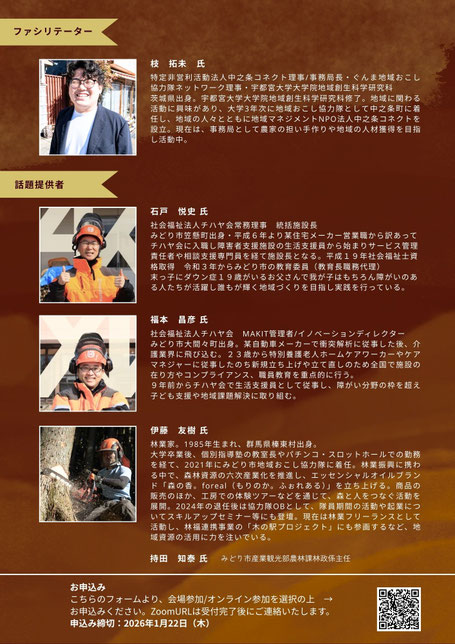 協働事例として社会福祉法人チハヤ会とみどり市の林福連携の取り組み「MAKIT」についてお話して頂きます。野菜の栽培や収穫といった農福連携の取り組みは近年増えておりますが、林業との連携は珍しく、またみどり市の地域課題解決につながる事例として興味深いものがあります。