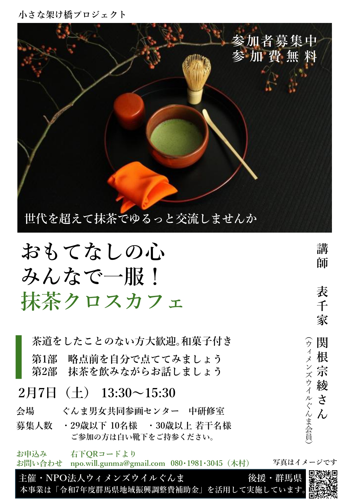 NPO法人ウィメンズウイルぐんま(Mサポ利用登録者)から、「抹茶クロスカフェ(略点前体験)」のお知らせです。