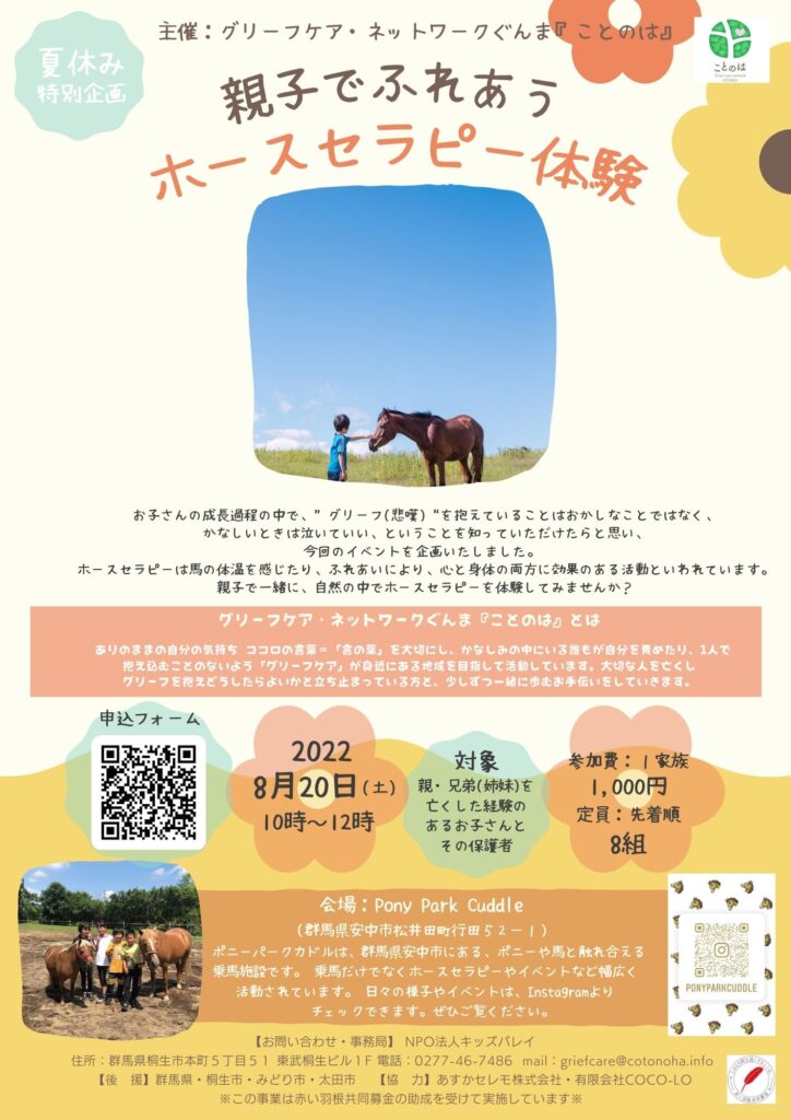 NPO法人キッズバレイ(Mサポ利用登録団体)グリーフケア・ネットワークぐんま ことのはから、「親子でふれあう ホースセラピー体験」のお知らせです。