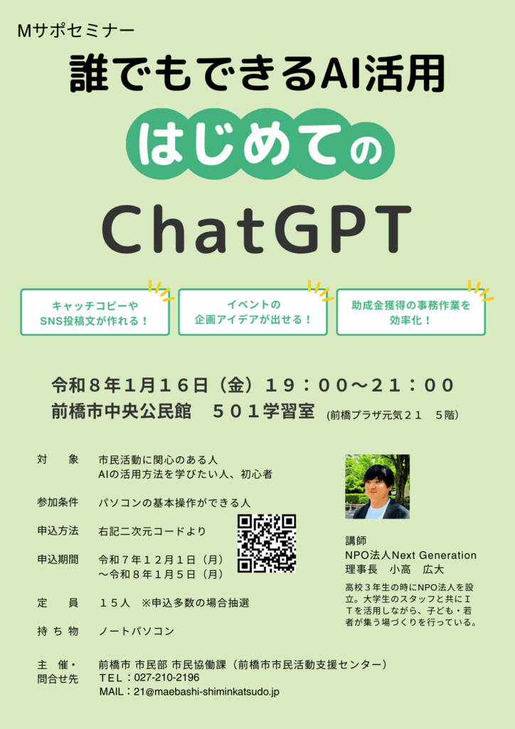 このセミナーではAI初心者を対象として、ChatGPTを使って文章作成やアイデア出しを効率化し、市民活動をもっと魅力的に発信する方法を学びます。