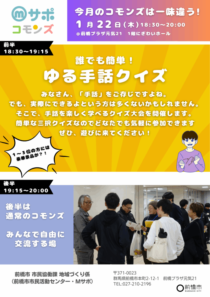 前半1時間をMサポ長期インターンシップ生による特別企画として、手話を楽しく学べるクイズ大会「誰でも簡単!ゆる手話クイズ」を開催します!(参加は任意です)3択クイズで誰でも気軽に参加できるので、手話を全く知らない方、これから学びたいと考えている方におすすめです。