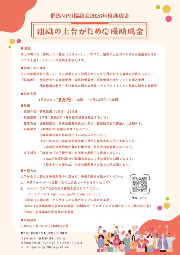 群馬NPO協議会から、2026年度助成金「組織の土台がため応援助成金」のお知らせです。