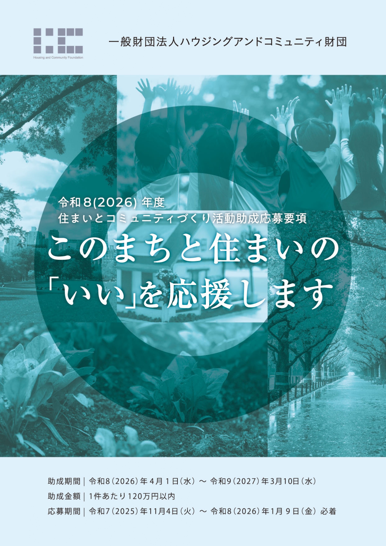 一般財団法人 ハウジングアンドコミュニティ財団から、令和8(2026)年度「住まいとコミュニティづくり活動助成」助成対象団体募集のお知らせです。